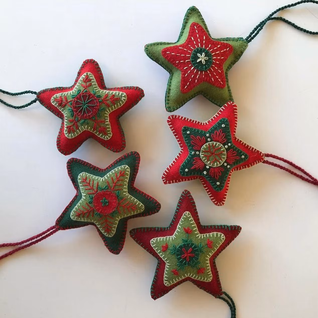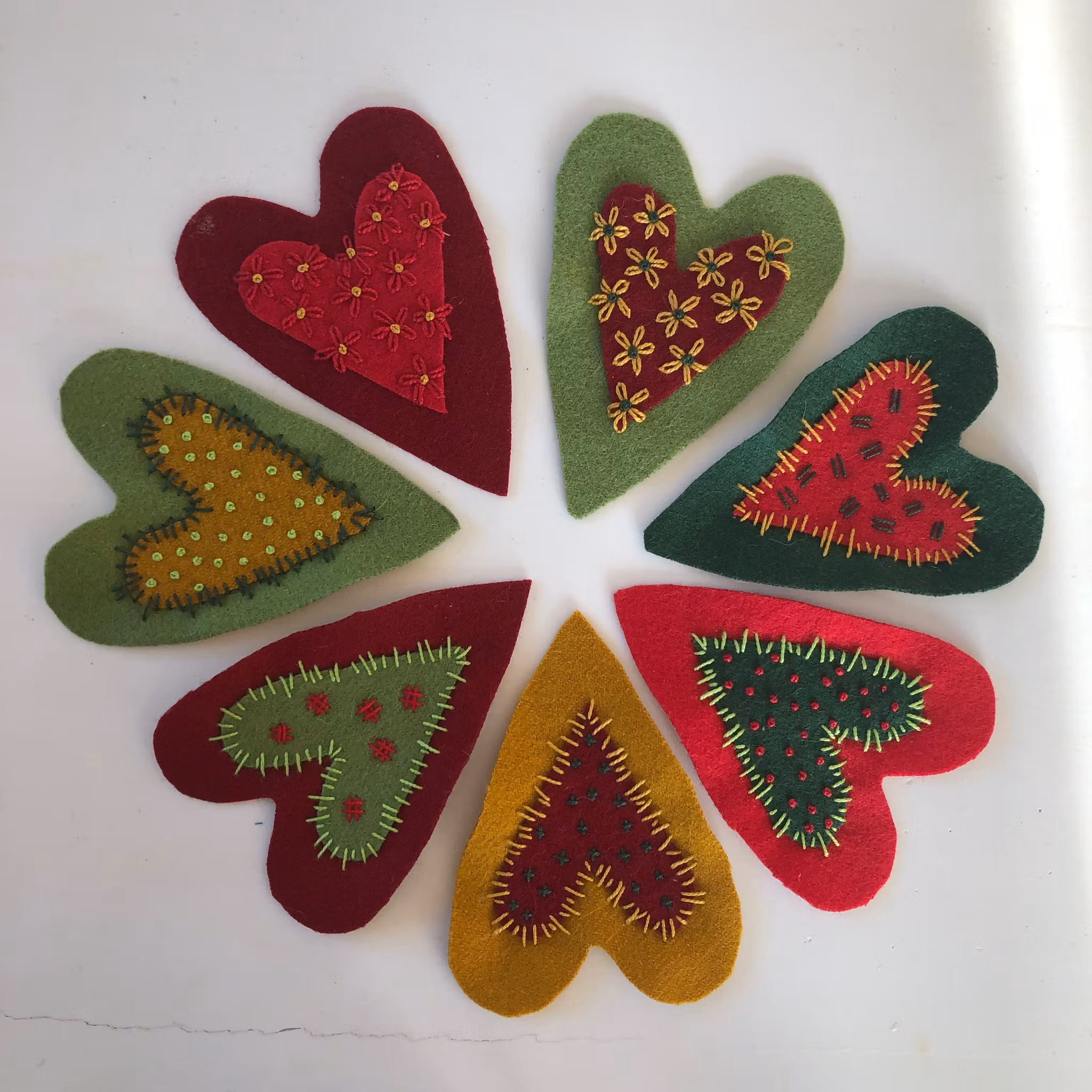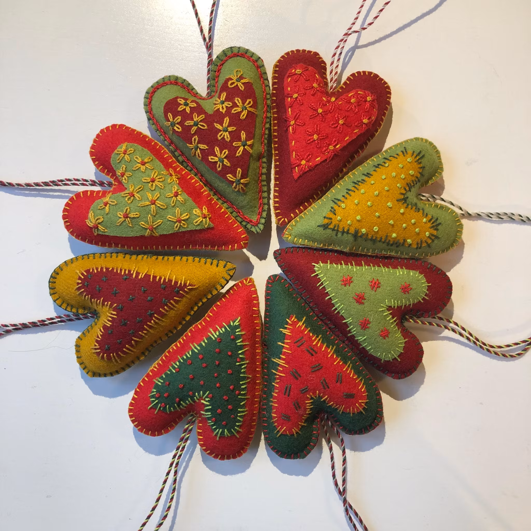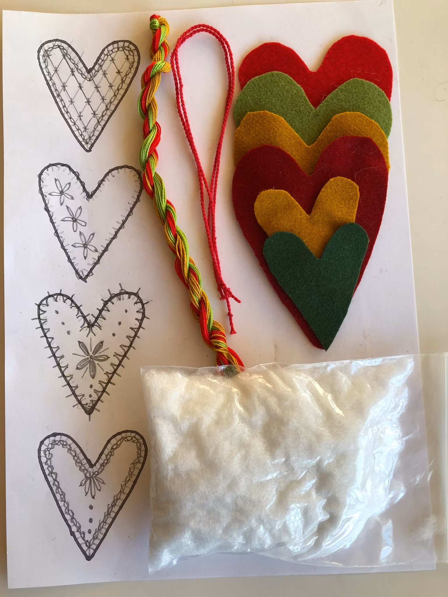 Matrialsats till två stycken hjärtan eller stjärnor.Materialsatsen innehåller: vadmal, broderigarner, nål, stoppning, handgjort upphängningssnöre och mönster oc