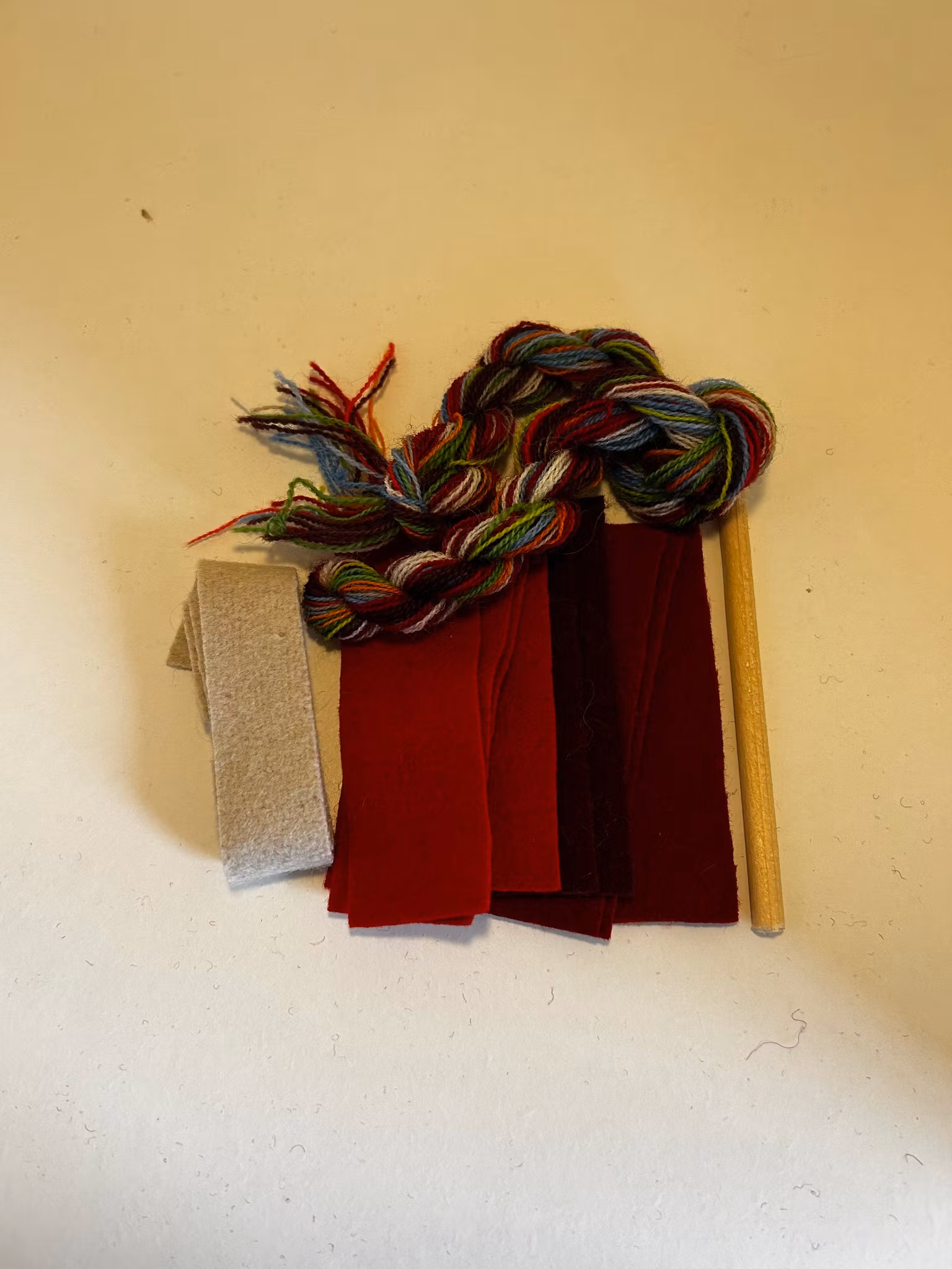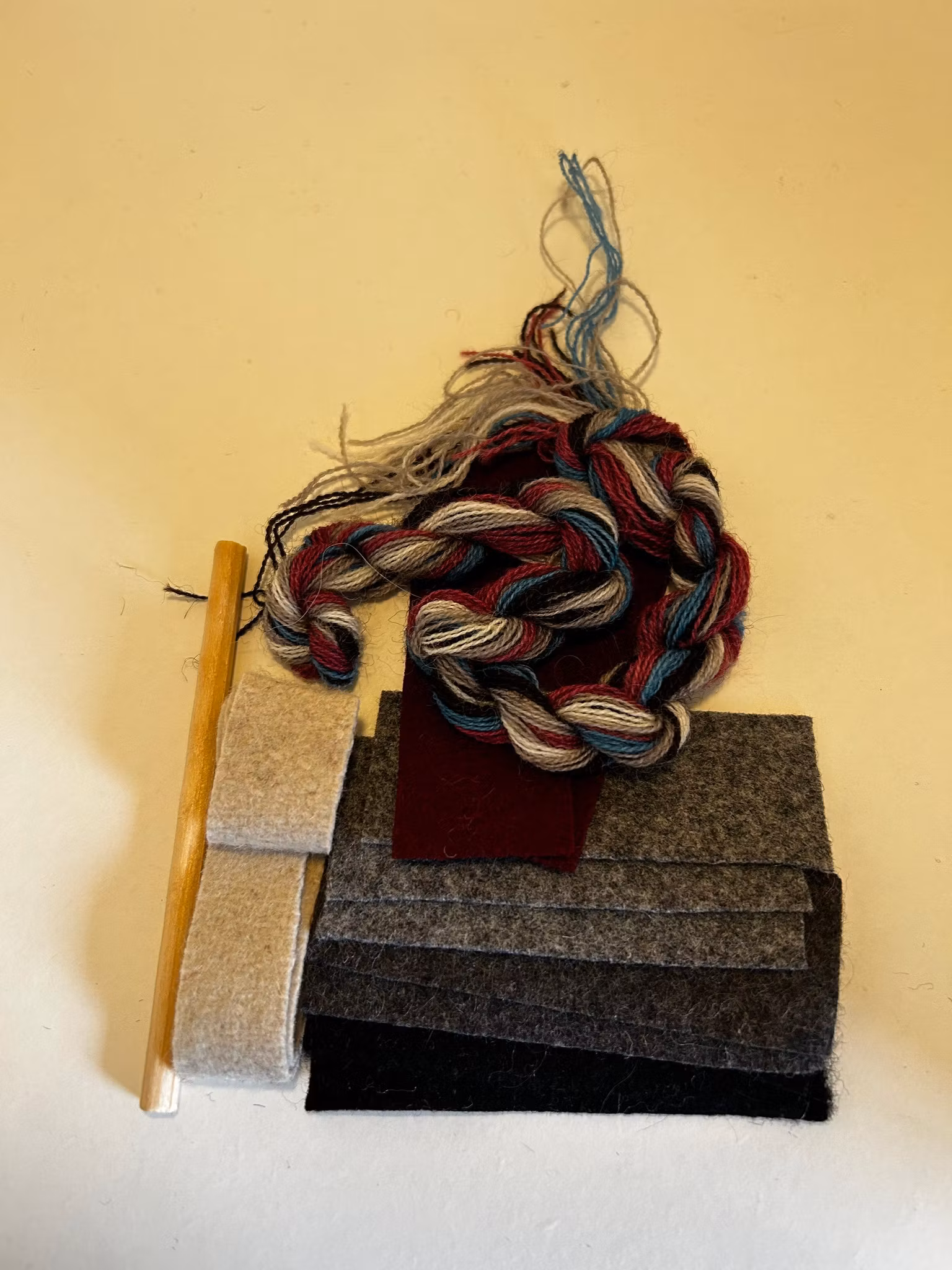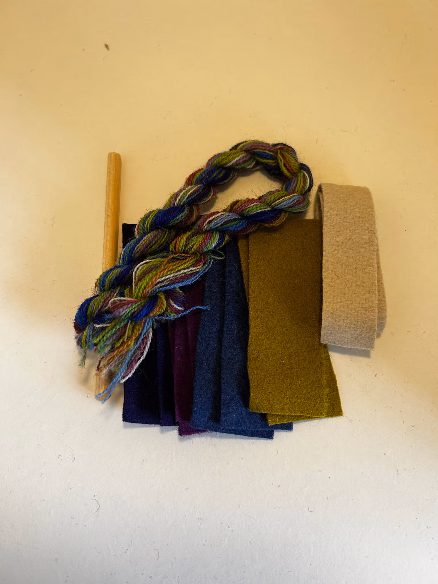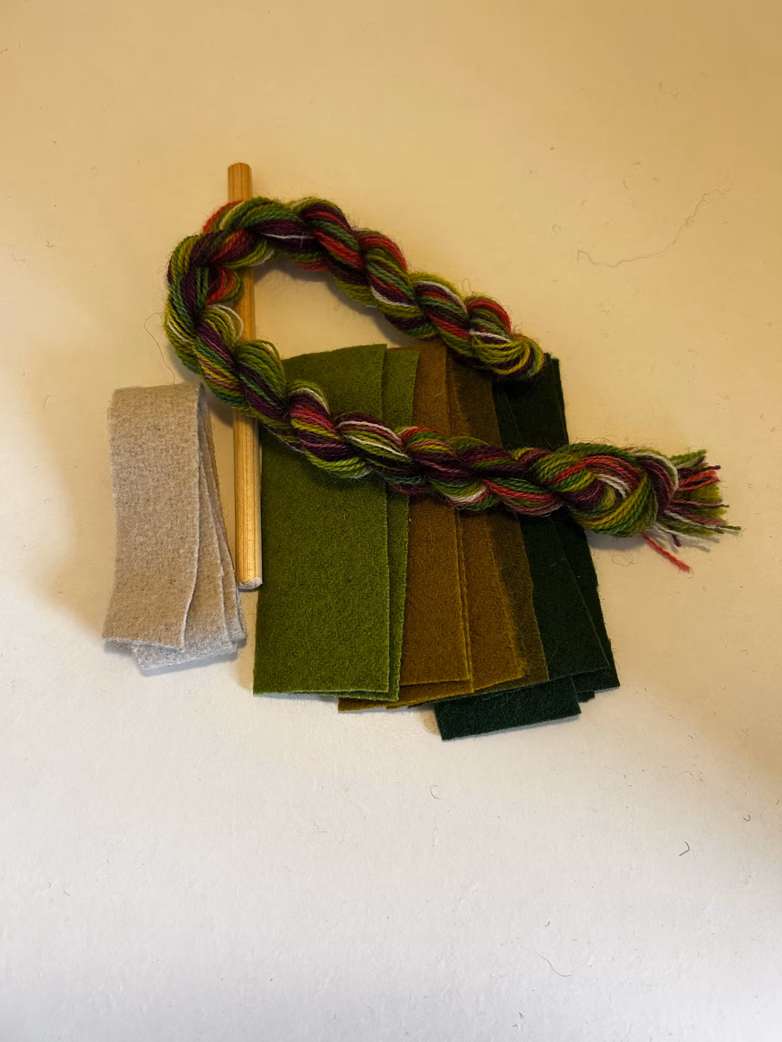 Sy dina egna ullpärlor. Materialsatsen innehåller: garn, vadmal i matchande färger till 10 stycken pärlor