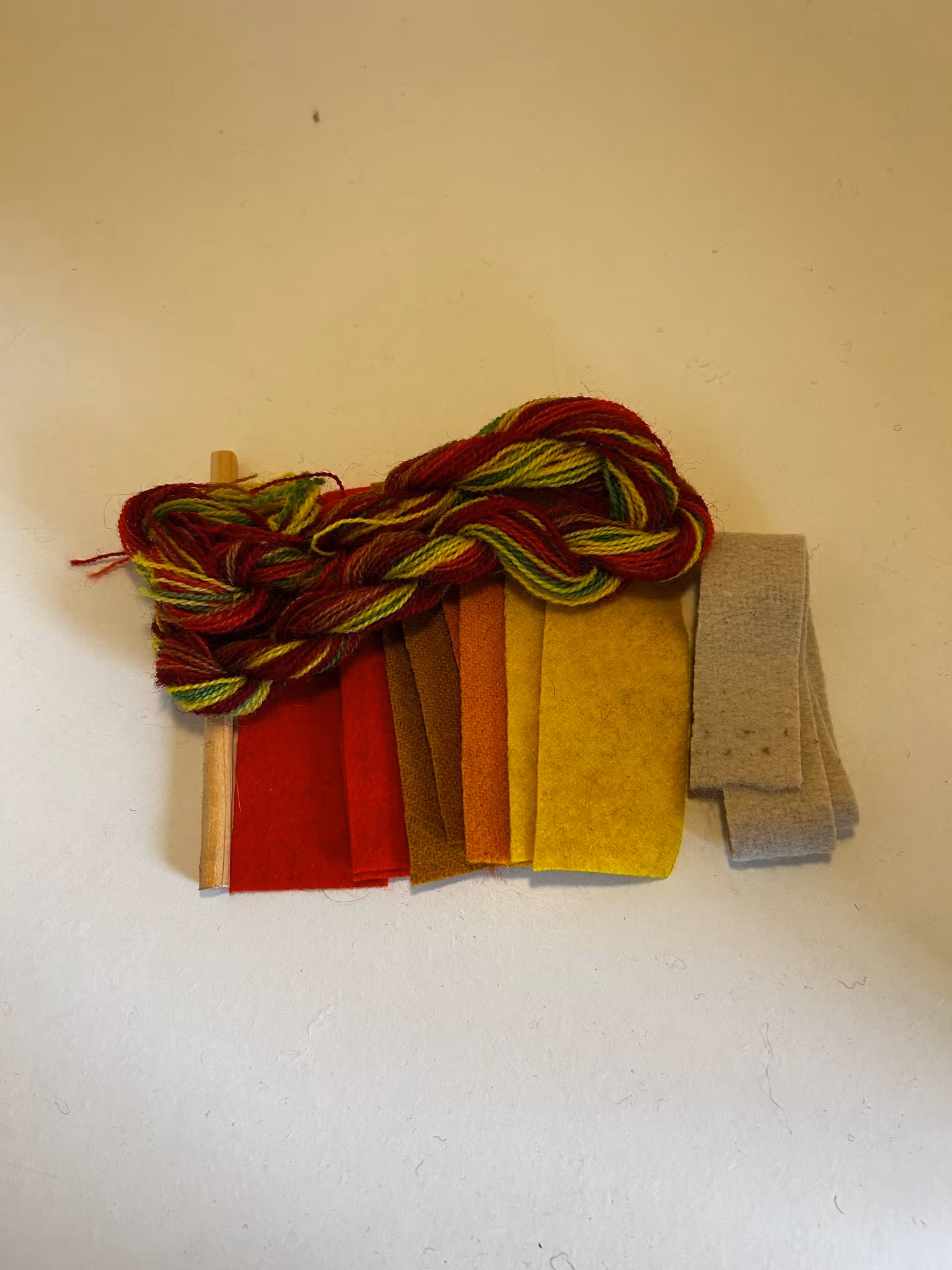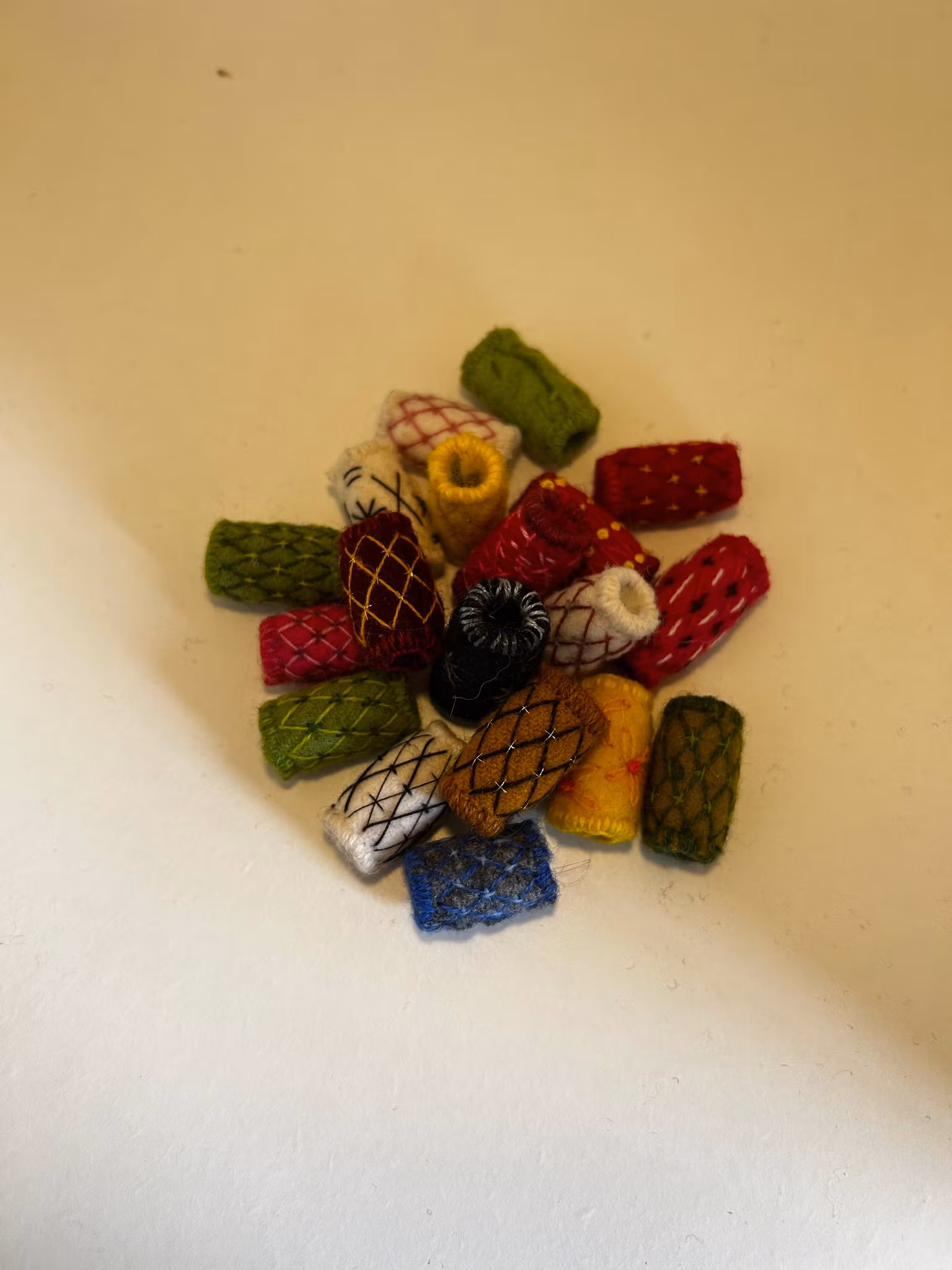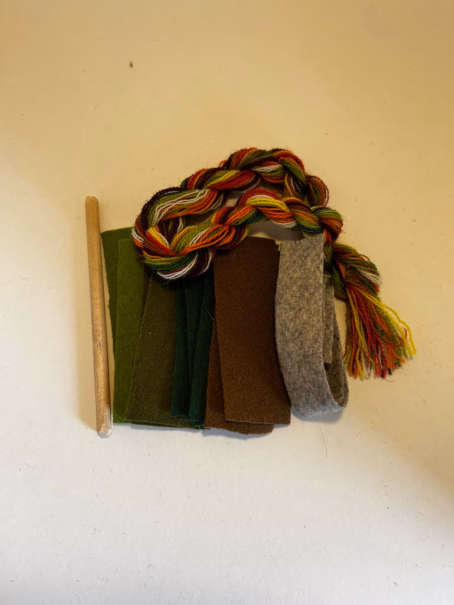 Sy dina egna ullpärlor. Materialsatsen innehåller: garn, vadmal i matchande färger till 10 stycken pärlor